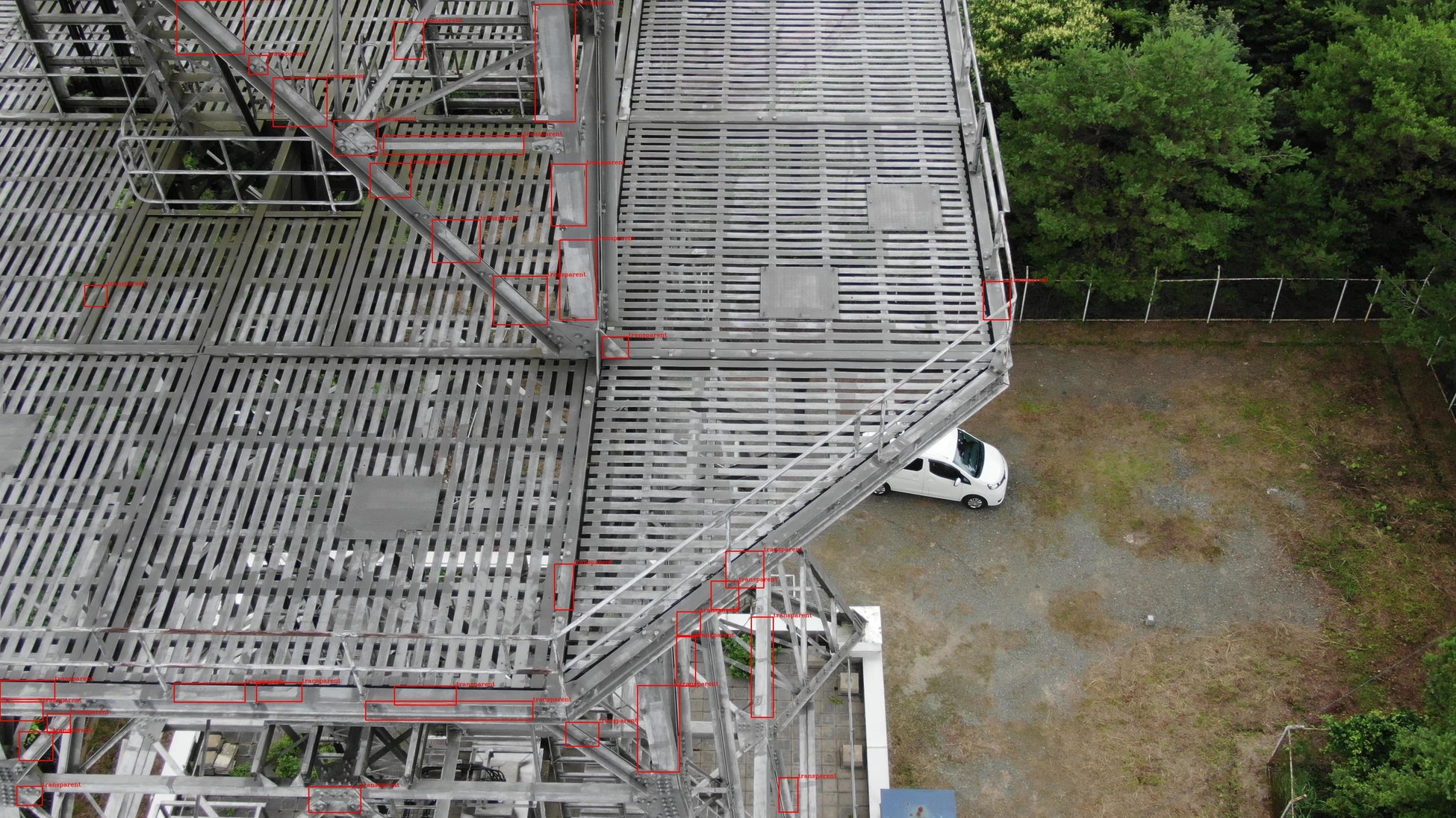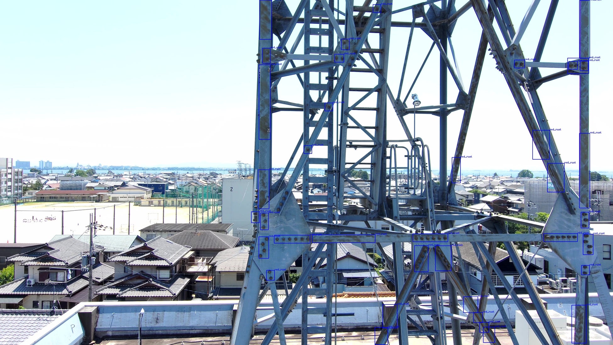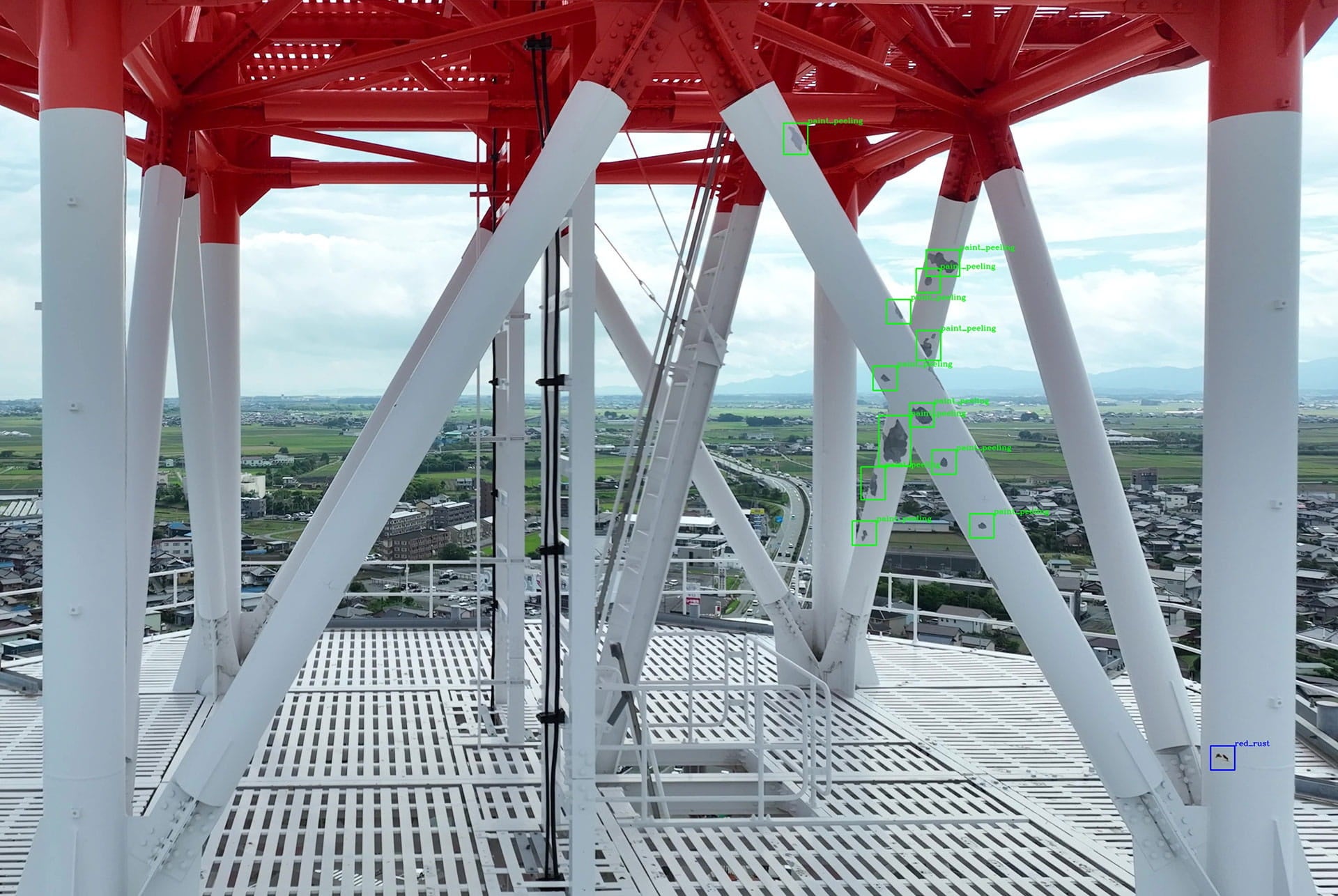 鉄塔部材における、赤さび、剥がれ、透けといった損傷の検出が可能。