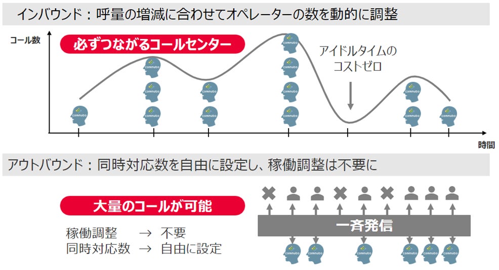 インバウンドコールでは、入電数の増減に合わせ、必要なAIオペレーター数を自動的に調整。アウトバンドコールにおいては、担当者が架電する場合と異なり、同時対応数を設定するだけで稼働調整は不要となります。