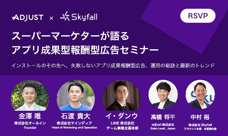 インターネット広告事業を展開する株式会社Skyfall(本社:東京都渋谷区、代表取締役社長:長谷川 智一、以下Skyfall)は、モバイルマーケティングアナリティクススイートのadjust株式会社(本社:独・ベルリン、CEO(最高経営責任者):サイモン・デュサール、日本ゼネラルマネージャー:佐々直紀、以下Adjust)と共催で、2023年6月8日(木)に無料セミナー「アプリ成果報酬型広告セミナー ~インストールのその先へ、失敗しないアプリ成果報酬型広告、運用の秘訣と最新トレンド~」を開催することをお知らせいたします。