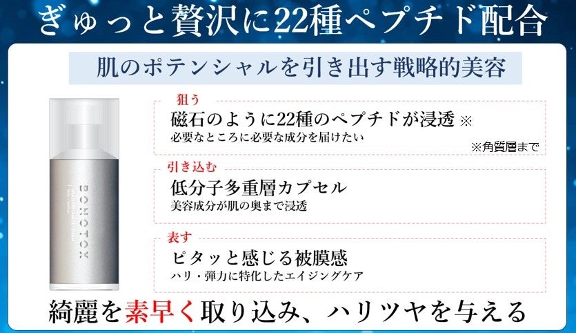 「BONOTOX セカンドスキンクリーム」は従来の美容概念を打ち破るビューティ×サイエンス×テクノロジーを駆使し、医療密閉療法から着目した「高分子美容成分膜形成」技術(美容成分タンパク質)で作られる高機能エイジングケア*パックです。