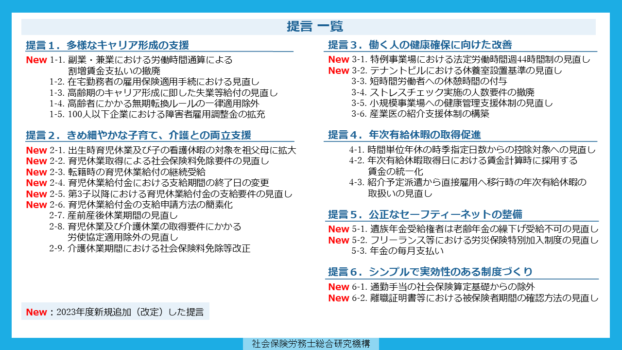提言の取りまとめにあたっては、全国の社労士から広く意見募集を行っており、本年度は新たに11項目の提言を追加し、柔軟な働き方の推進を阻害している法制度や、現場で不公平・非効率な運用を生んでいる法規制の改善提案を中心に、28項目の提言を取りまとめた。