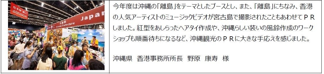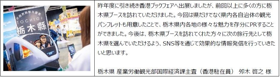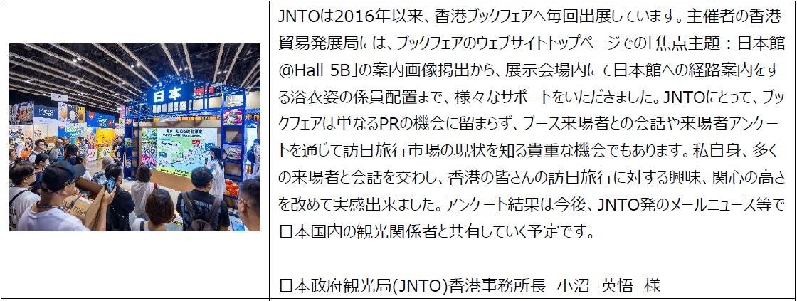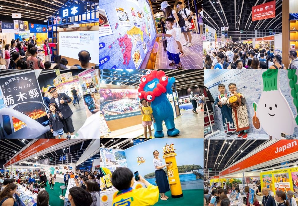 99万人が来場した香港最大規模のBtoC見本市、第34回「香港ブックフェア」と、同時開催の第7回「香港スポーツ&レジャーエキスポ」、第4回「ワールド・オブ・スナック」は、2024年7月23日に盛況のうちに閉幕しました。今年のジャパンパビリオンには、北は北海道から南は沖縄県まで26地域の自治体及び観光協会に、在香港日本国総領事館、日本政府観光局(JNTO)等が出展し、各出展社は、香港からの更なる誘客促進を目的として、ブースでの最新の観光情報の紹介に加え、ご当地キャラクターが登場するイベント等を行いました。