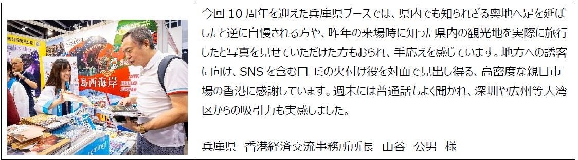 2023年の訪日香港人客数は*約219万人でしたが、今年6月の訪日香港人客数は延べ *25万600人(前年同月比34.5%)と当月の過去最高を記録し、コロナ禍前の水準を大幅に上回っています。依然として香港人に絶大的な人気を誇る日本旅行ですが、今年もジャパンパビリオンでは年齢問わず多くの香港人が会場を訪れ、各ブースでの最新の観光情報の説明に、熱心に耳を傾けていました。