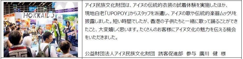 会場のメイン入口前に位置する日本政府観光局は、日本の美食をテーマに各地のグルメやお酒を紹介し、香港人が今一番行きたい日本の旅行先を示すホットスポットマップの展示を行いました。ブース内のステージでは、日本の出展社による観光PRや、日本文化の紹介イベント等も開催されました。北海道観光機構が運営した北海道ブースは、主に白老町のウポポイ(民族共生象徴空間)のプロモーションを行い、パンフレットやグッズ等の配布だけではなく、演者らによるアイヌ舞踊や音楽の披露、またVRを活用した体験イベントを通じ、施設の情報発信を行いました。大阪・関西万博は、公式キャラクターミャクミャクとの記念撮影会やクイズイベントを、期間中毎日開催しました。広島県観光連盟が運営した広島県ブースでは、広島レモンの黄色を基調としたブース設営を行い、マスコットの「ひろくま」による観光やグルメ等の紹介を行いました。福岡県ブースには、熊本県や鹿児島県もカウンターを設け各県の観光情報の紹介や、ブースに駆けつけたくまモンと来場者との交流を通じ、熊本はじめ九州の人気の観光スポットを宣伝しました。宮崎県は、ブース内に青島の観光スポット「幸せの黄色いポスト」を設置し、手紙の投函や記念撮影を行う来場者で賑わいました。また期間中、自見はなこ万博担当大臣がジャパンパビリオンを視察し、大阪・関西万博のプロモーションに加え、来場者や日本の出展社との交流もされました。