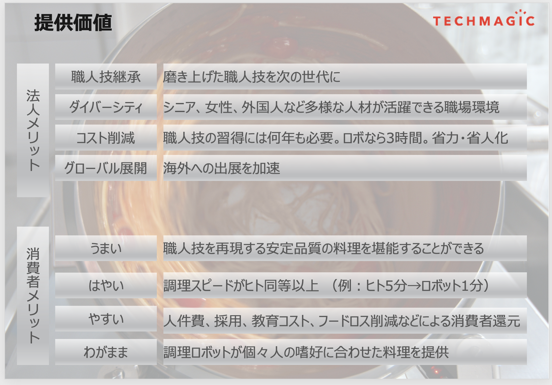 TechMagicは、「テクノロジーによる持続可能な食インフラ社会を実現する」ことをビジョンとして、2018年2月に設立。食を取り巻く多くの企業が直面する人手不足を解消し、生産性の高い社会を実現するために、ハードウェアとソフトウェア両方の技術を高度に融合した各種プロダクトの企画、設計、販売、保守を行っています。