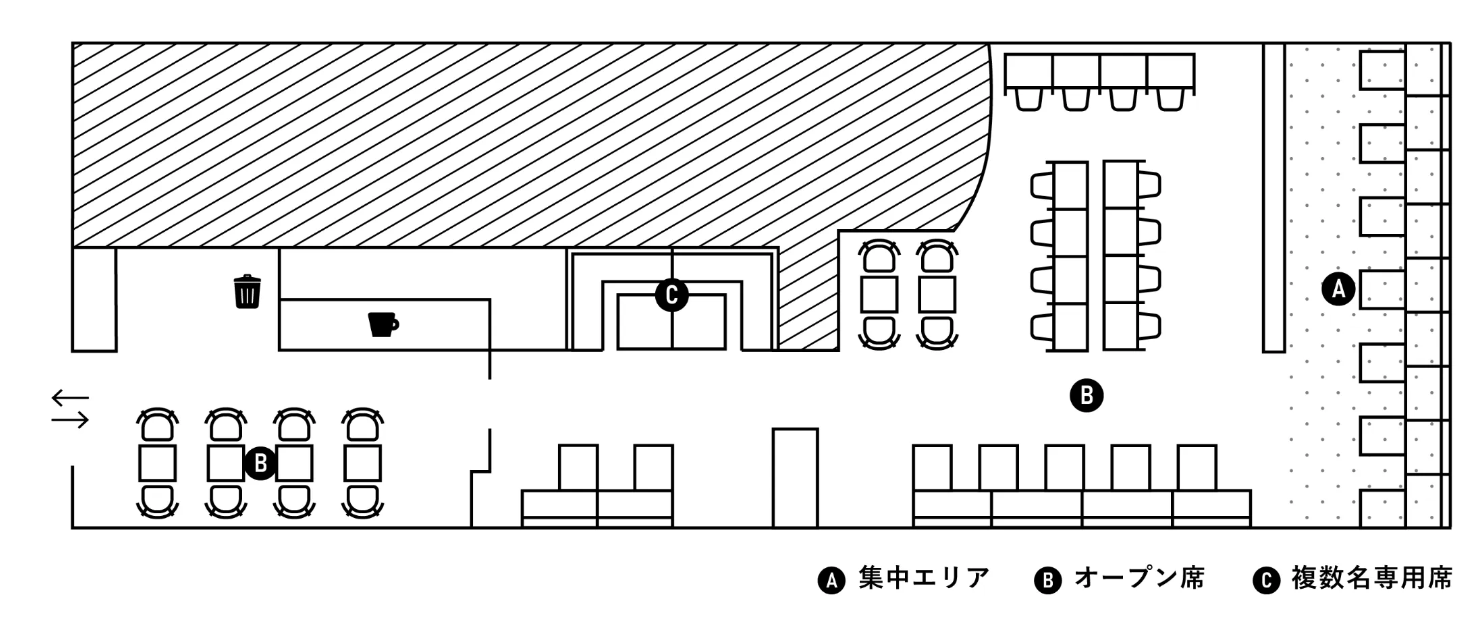 A 集中エリア(7席):通話や打ち合わせは不可、静かな空間で作業が捗ります。