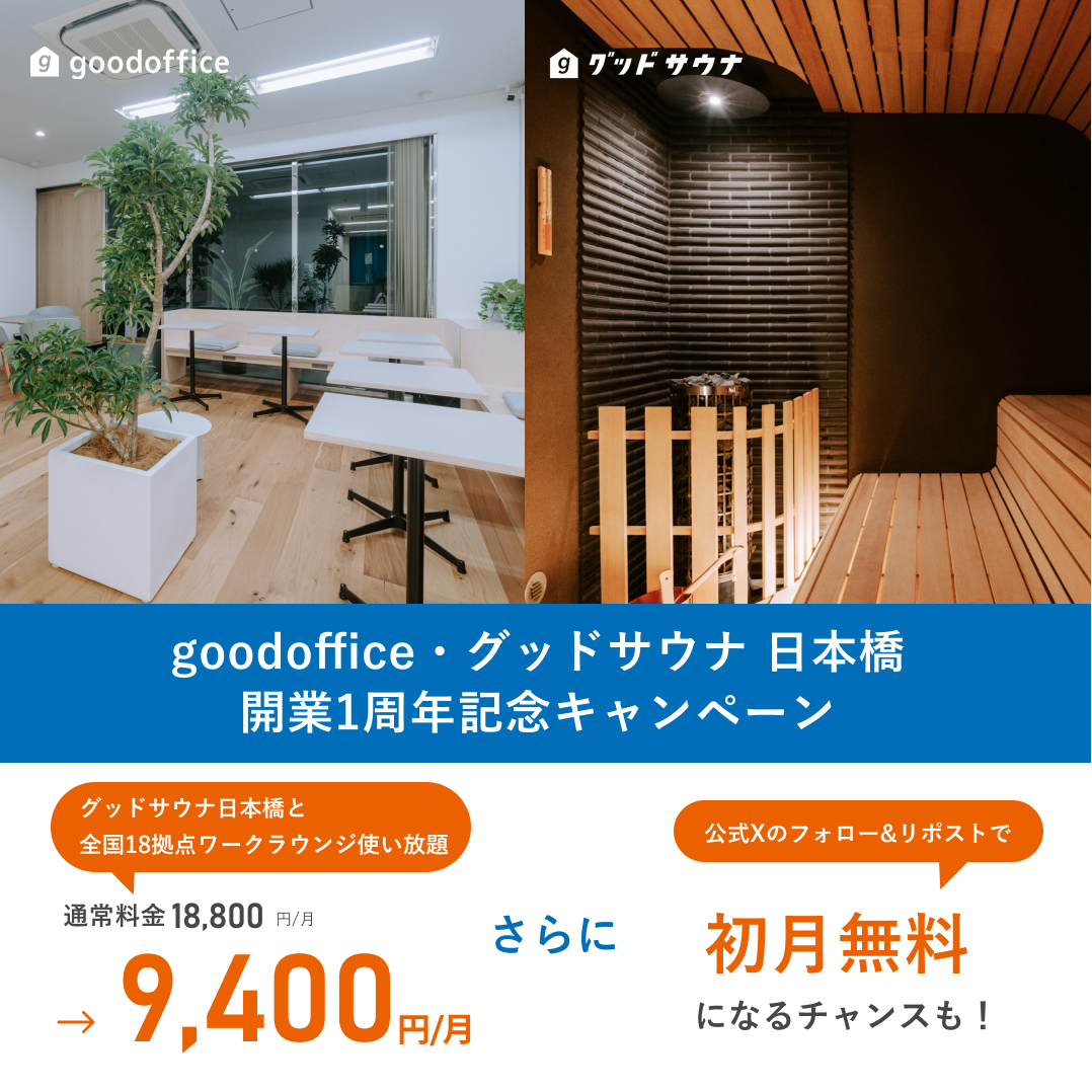 「goodoffice日本橋」、「グッドサウナ日本橋」の開業1周年を記念し、月額会員(全拠点利用プラン)の割引キャンペーンを実施しております。お得なこの機会に、ご利用を検討いただけますと幸いです。