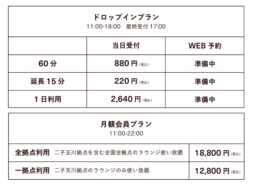 「ドロップイン利用プラン」では、ご予約・会員登録不要、1時間880円(税込)でご利用いただけます。ドロップイン利用はもちろん、月額会員プランでお得にご利用いただくことも可能です。