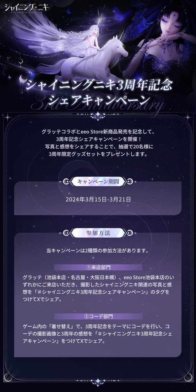 大人気3D着せ替えコーデRPG『シャイニングニキ』が3月18日でリリース3周年を迎えます。3周年を記念して、アニメイトカフェグラッテ3店舗&eeo Store 池袋本店とのコラボが決定したことをお知らせいたします。