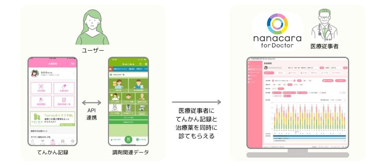 これにより医師が診察をする時、nanacaraのてんかん発作記録とharmoおくすり手帳に登録した抗てんかん発作薬を同時に確認することができ、てんかん症状の記録・分析や、お薬による発作のコントロールの調整などにおいて、より効率的に活用できるようになります。