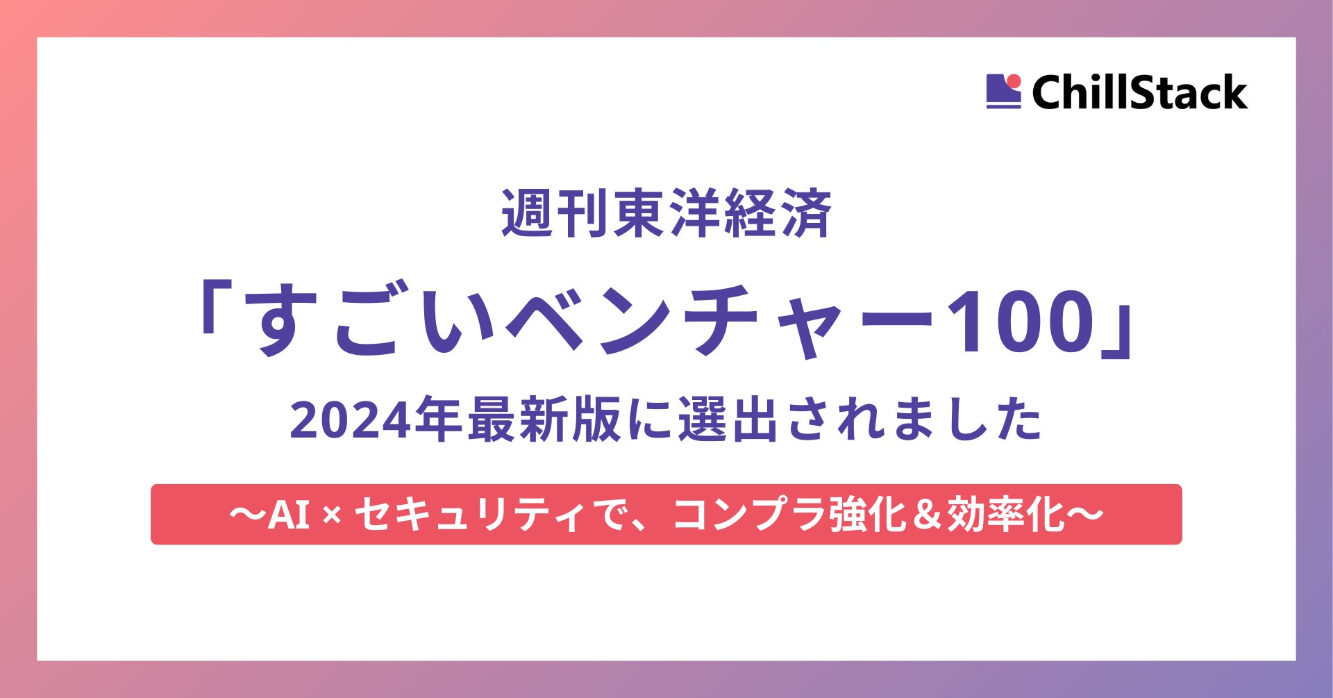 AIを用いた高精度な不正検知サービスやサイバーセキュリティサービスを開発・提供している株式会社ChillStack(本社:東京都渋谷区、代表取締役:伊東道明、以下ChillStack)は、ビジネス経済誌『週刊東洋経済』の「すごいベンチャー100」2024年最新版に選出されたことをお知らせいたします。