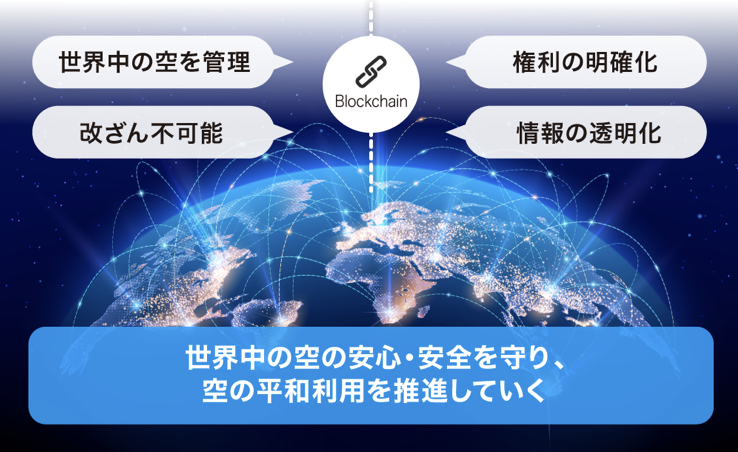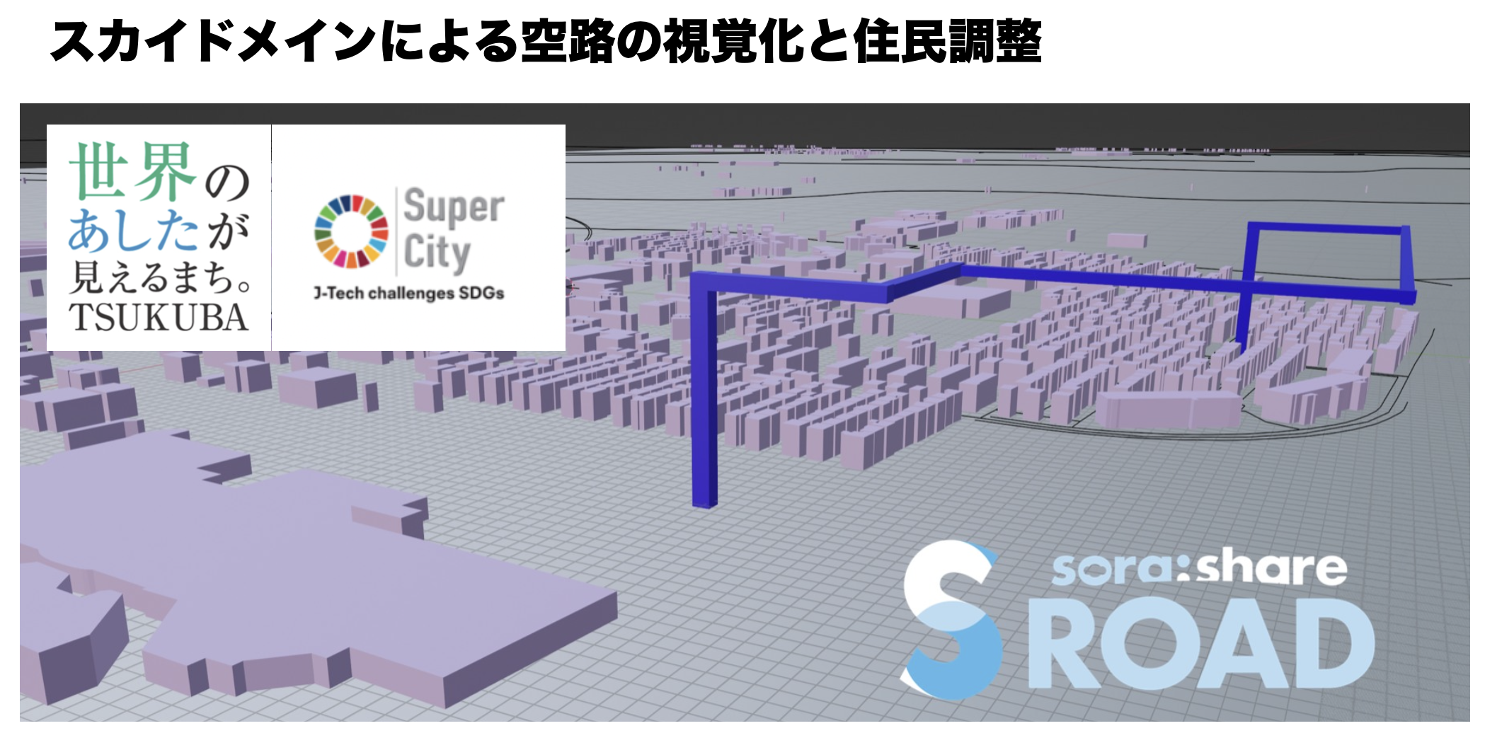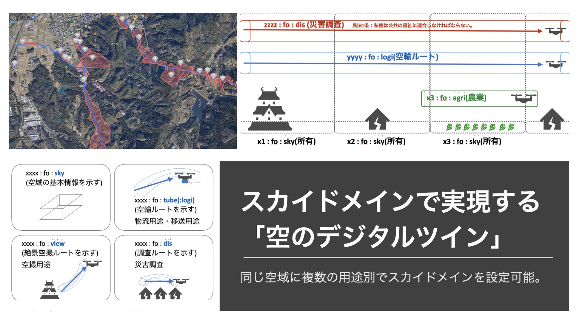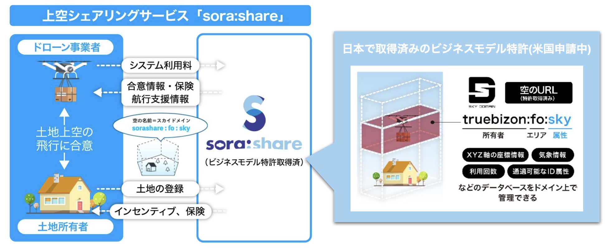ソラシェアには3次元空間(緯度・経度・高度のデータセット)に名称を与える「スカイドメイン」という仕組みを導入し、世界中の空を識別します。空のURLともいうべき「スカイドメイン」に紐づくデータベースには、空域の3次元情報以外にもドローン飛行の合意状況、インセンティブの内容から、土地所有者や管理者の情報、平均風速や気象などのリスク要素に至るまで格納でき、それらの情報には必要に応じて外部からのアクセスも可能な設計となっています。