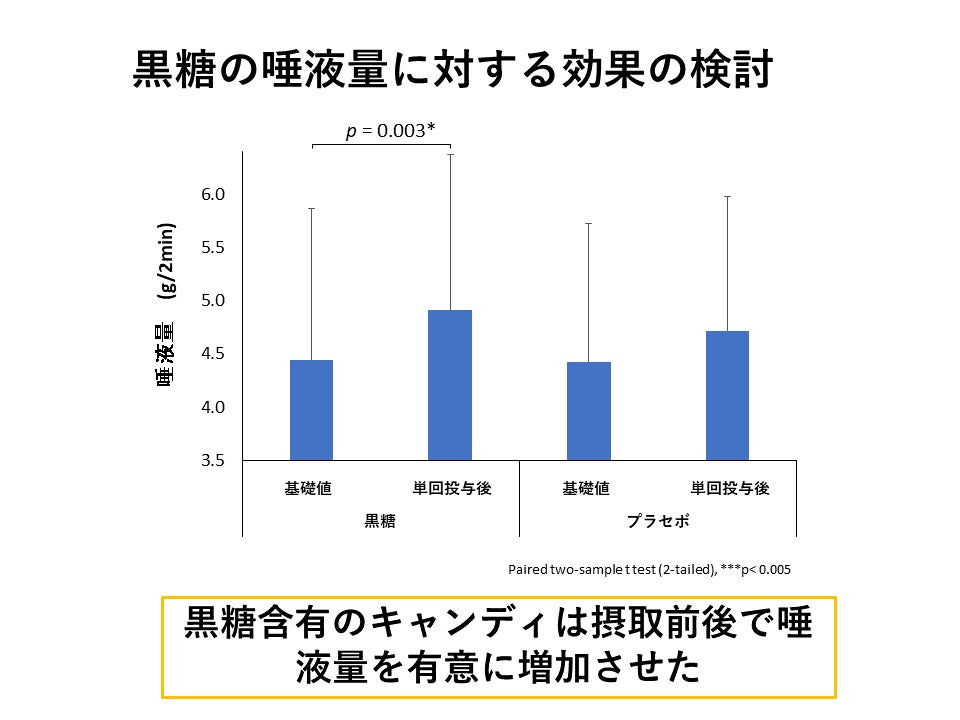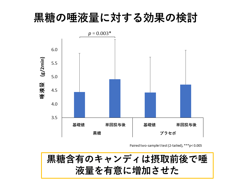 その結果、沖縄県産黒糖を使用したキャンディの摂取は、黒糖を含まないキャンディの摂取と比較して唾液分泌を促進することが明らかになりました。(図2)