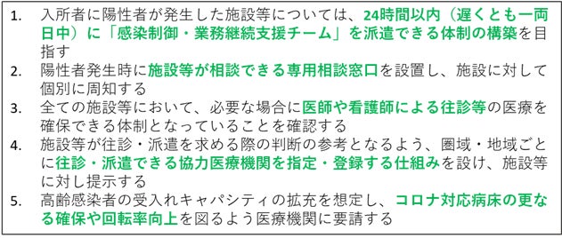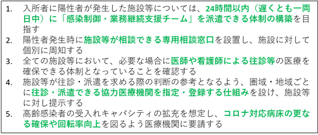高齢者施設の入所者において、新型コロナウイルス感染症の陽性者が発生した場合、医療機関への入院(病床ひっ迫の場合例外的に入所継続(施設内療養))が円滑に行われるようにするとともに、医療関係者が施設に直ちに派遣され感染拡大防止と業務継続のために必要な医療支援が行われることが求められております。