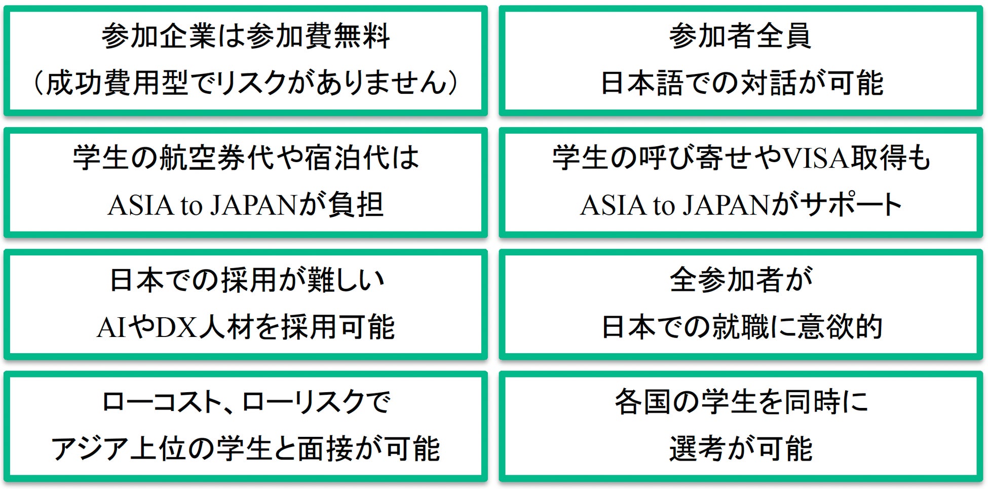 ASIA to JAPANでは、FAST OFFER 面接会を含め、採用後に必要となるVISA取得や来日の手配、来日する学生の空港での出迎え、日本での生活立ち上げのサポート、そして採用から来日までの準備期間を利用した日本語教育まで一貫して対応しております。今後はそれに付随し、住居の手配や日本での生活を継続的にサポートする場の構築など、採用する企業と日本で働く外国籍の方が双方にとってより安心した環境づくりを目指しています。