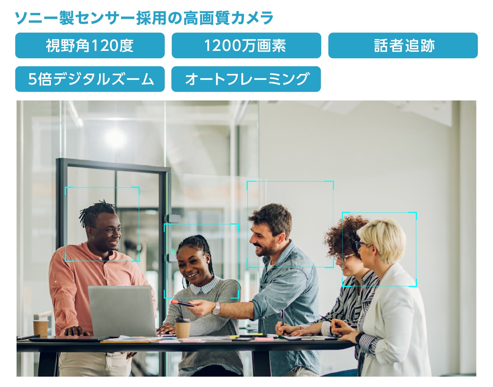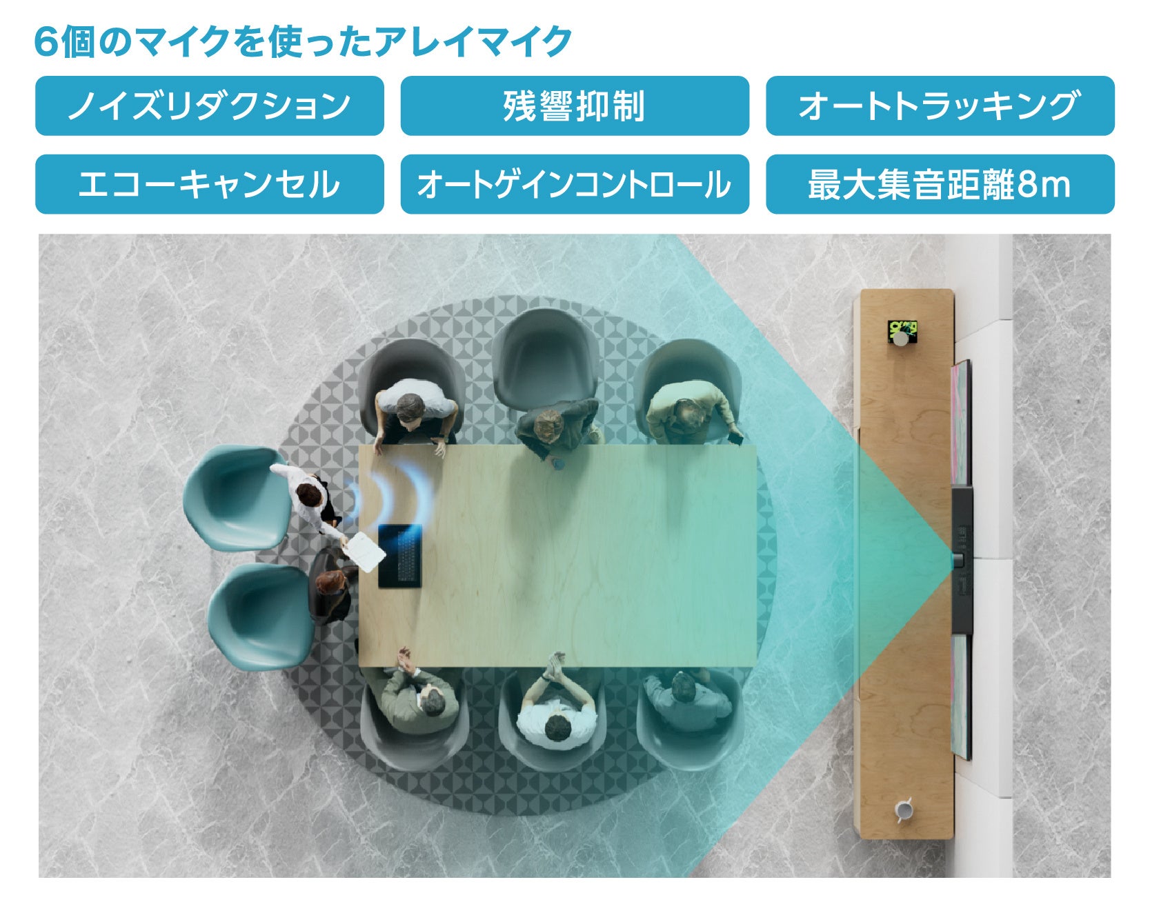 本体内蔵のマイクは6つのマイクを使ったアレイマイクです。最大8m先の人の声をしっかりと拾い、周囲の雑音は自動で除去します。また、発言者の位置を特定し、音量を自動調整して、相手に届けることができます。本体内蔵のカメラは120度の広角レンズで、会議室にいる全員を映したり、5倍デジタルズームにより参加者を個別でクローズアップしたりすることが可能です。