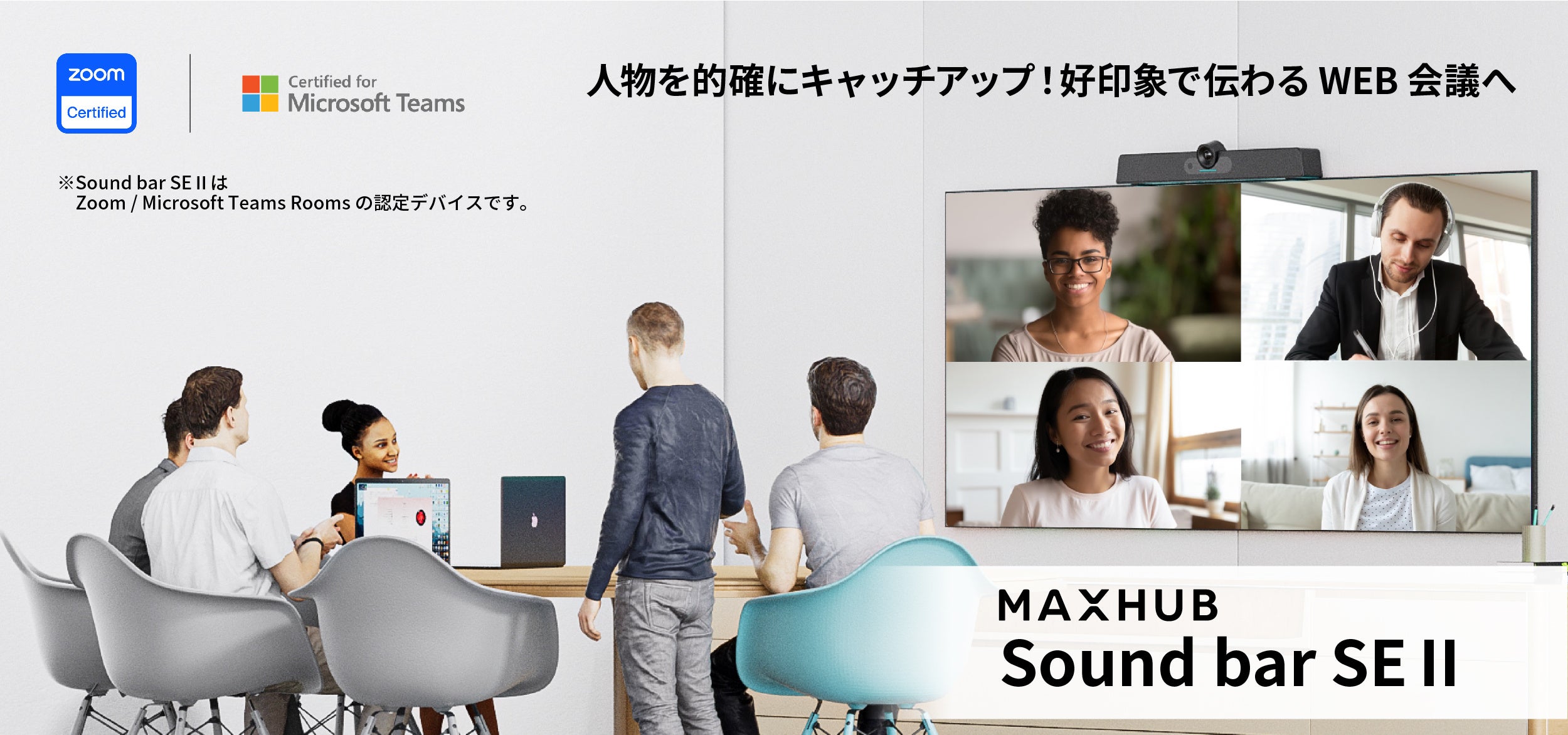 毎日のように企業のDX化への取り組みがメディアに取り上げられている昨今。それを後押しするツールは世の中にあふれています。しかし、DX化を目指して導入したツールが多すぎて使いこなせず、かえって業務効率が下がった経験のある方も多いのではないでしょうか。今回弊社より販売開始する「Sound bar SEⅡ」は「Sound bar SE」の後継商品に位置付けられます。「Sound bar SE」はカメラ、マイク、スピーカーが一体となった、1台3役のWEB会議システムです。この1台をPCと接続するだけで、複雑な配線もなく、どなたでも簡単にWEB会議を始められる利便性から、多くのお客様の業務効率改善をサポートしてまいりました。「Sound bar SEⅡ」では従来の利便性はそのまま、更に高画質・高性能に。特にグレードアップしたのは「AIオートフレーミング機能」です。従来商品よりも発言者の追跡速度や正確性が向上し、より対面に近い雰囲気でWEB会議を行えます。その結果、発言者を確認するといった会議中のムダをなくし、自然なコミュニケーションが実現します。また、「Sound bar SEⅡ」はZoomとMicrosoft Teams Roomsの認定ハードウェアです。オーディオ・ビデオ両方のパフォーマンスにおいて高い基準を満たし、信頼性の高い機器として認定されています。
