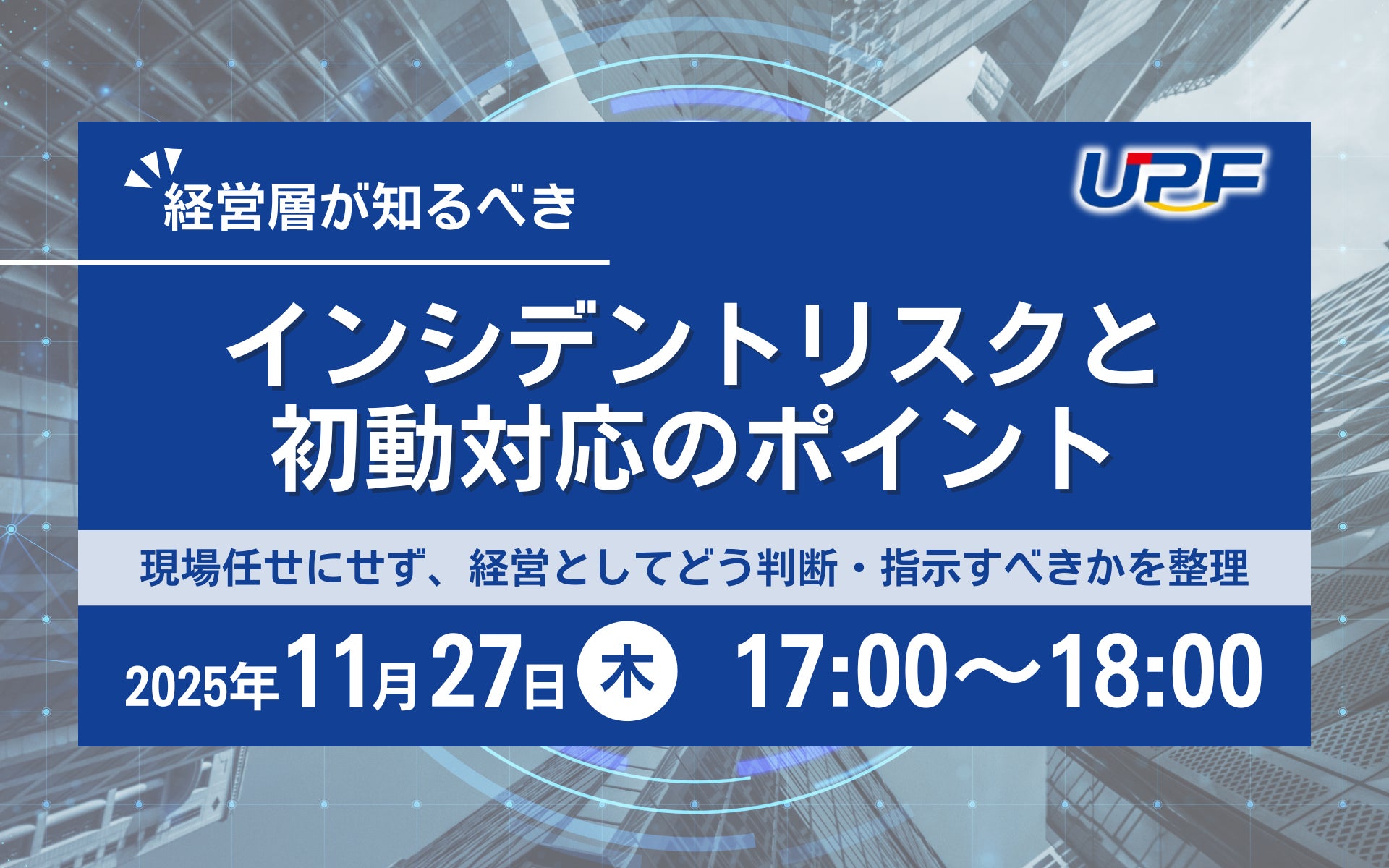 リスクマネジメント分野のコンサルティングサービスを提供する株式会社UPF(本社:東京都中央区、代表取締役:仲手川 啓、以下当社)は、2025年11月27日(木)17:00より、経営層・管理職の方向けに、情報セキュリティインシデント発生時に求められる判断・対応を整理するオンラインセミナーを開催いたします。