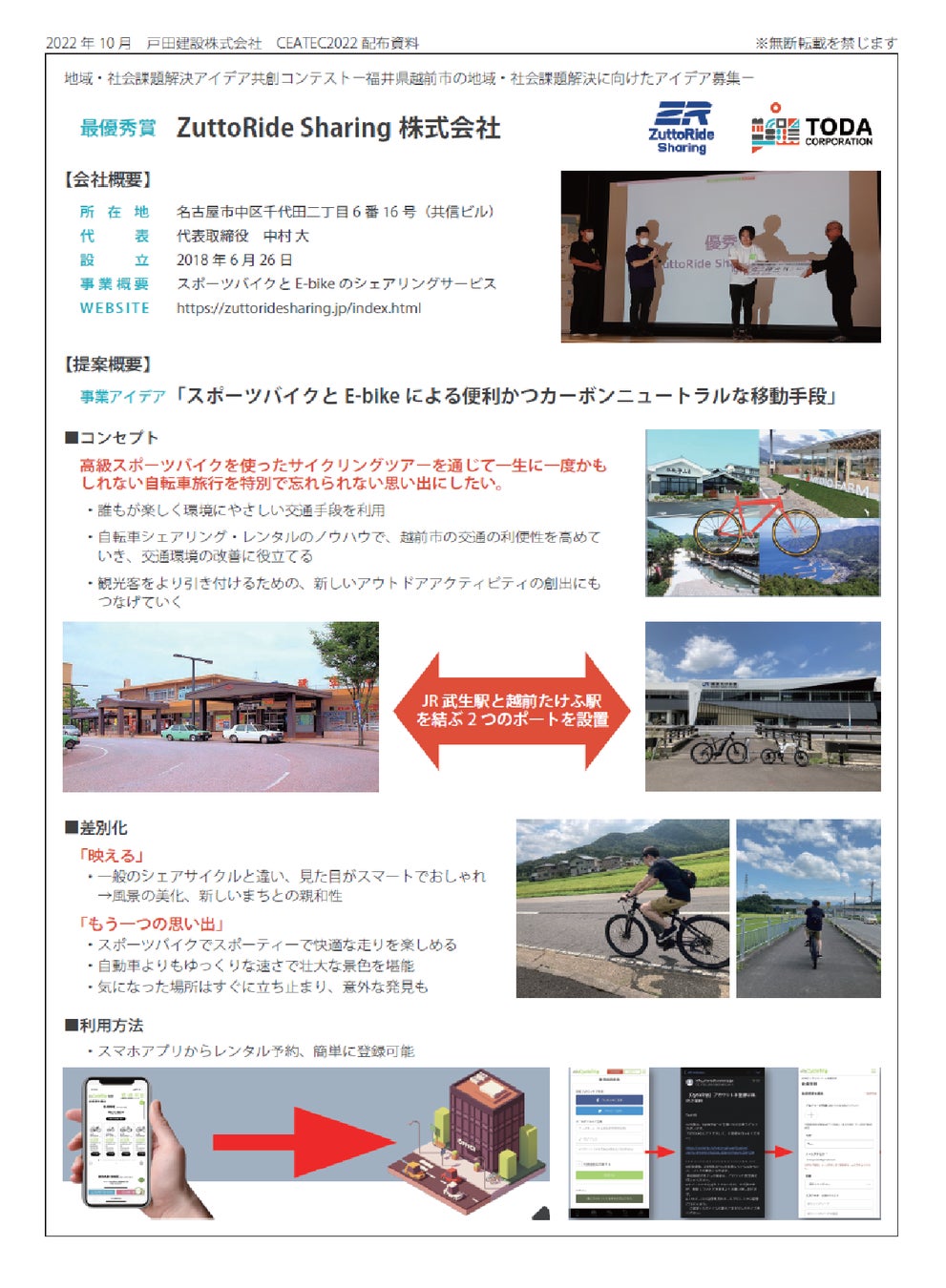 ZuttoRide Sharing株式会社(本社:愛知県名古屋市、代表取締役:中村大)は北陸新幹線の新駅「越前たけふ駅」周辺での官民連携のパートナー企業である戸田建設株式会社(本社:東京都中央区、社長:大谷 清介)が主催するスタートアップ企業を対象とした「地域・社会課題解決アイデア共創コンテスト」にて優秀賞を受賞いたしました。
