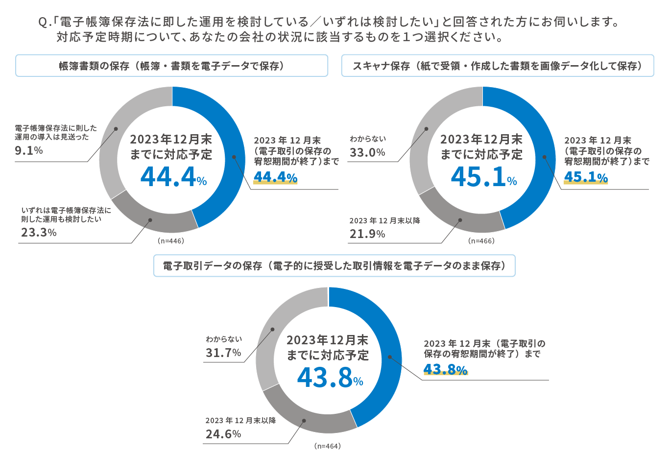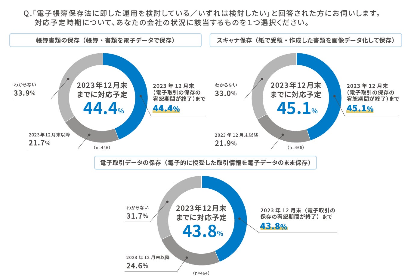 ■「2023年12月末(電子取引データの保存の宥恕期間が終了)まで」に対応予定とした企業は、帳簿書類の保存が44.4%、スキャナ保存が45.1%、電子取引データの保存が43.8%という回答結果に