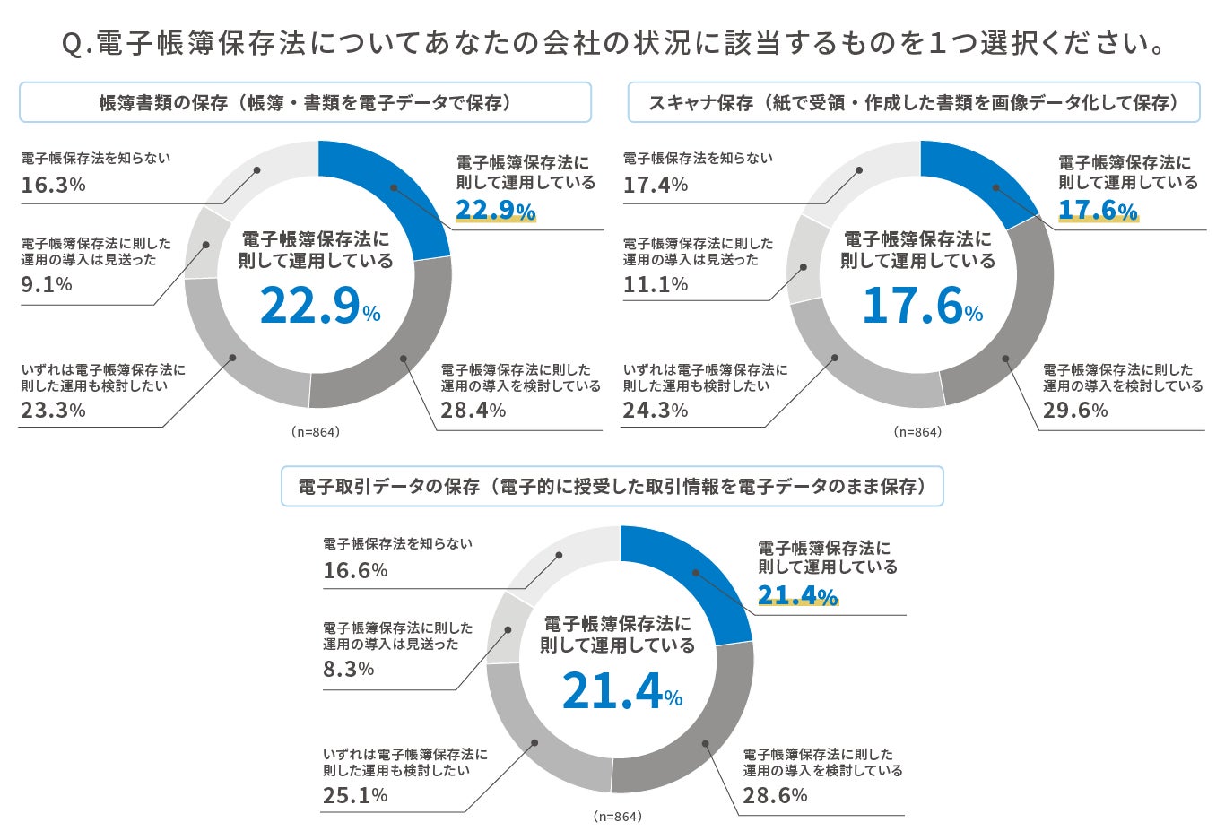 ■電子帳簿保存法に「則して運用している」企業は、帳簿書類の保存が22.9%、スキャナ保存が17.6%、電子取引データの保存が21.4%となり、3区分とも総じて対応が進んでいない