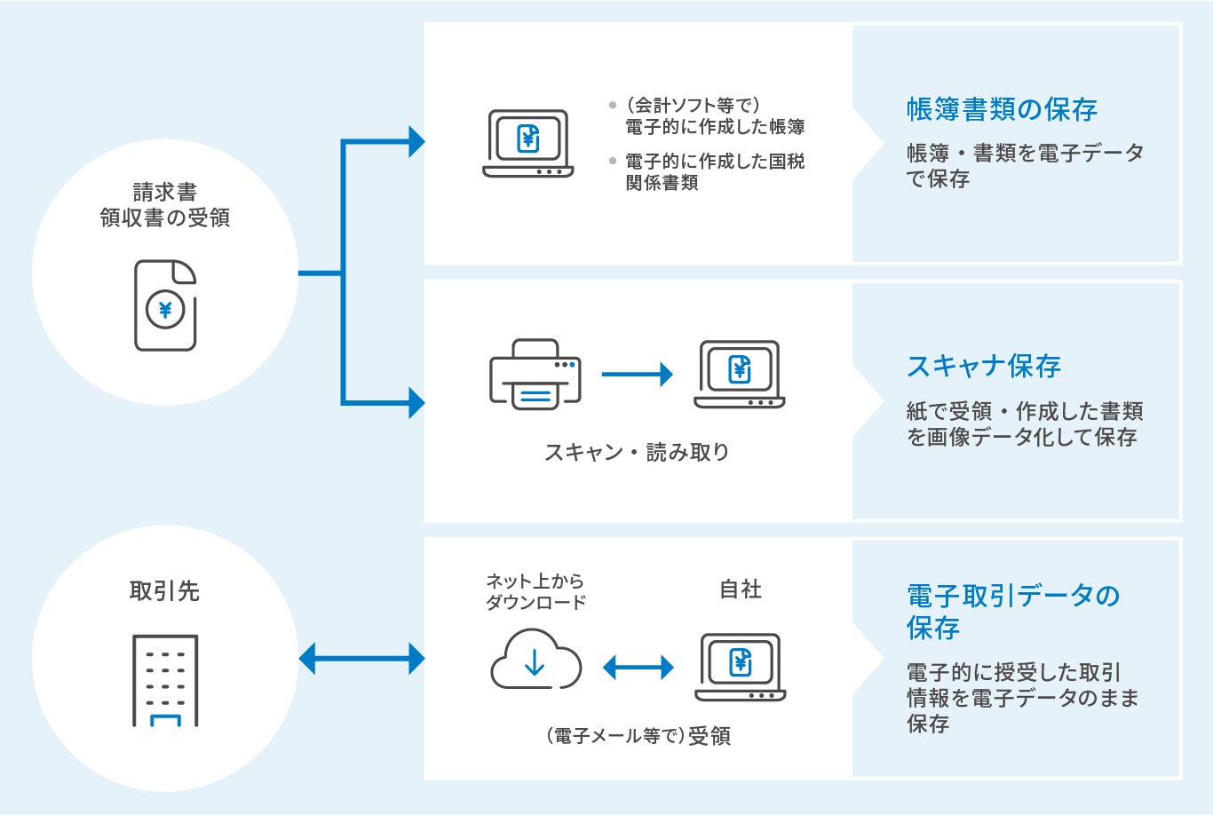 電子帳簿保存法において電磁的記録による保存は、帳簿書類の保存(帳簿・書類を電子データで保存)、スキャナ保存(紙で受領・作成した書類を画像データ化して保存)、電子取引データの保存(電子的に授受した取引情報を電子データのまま保存)の3区分に分かれています。