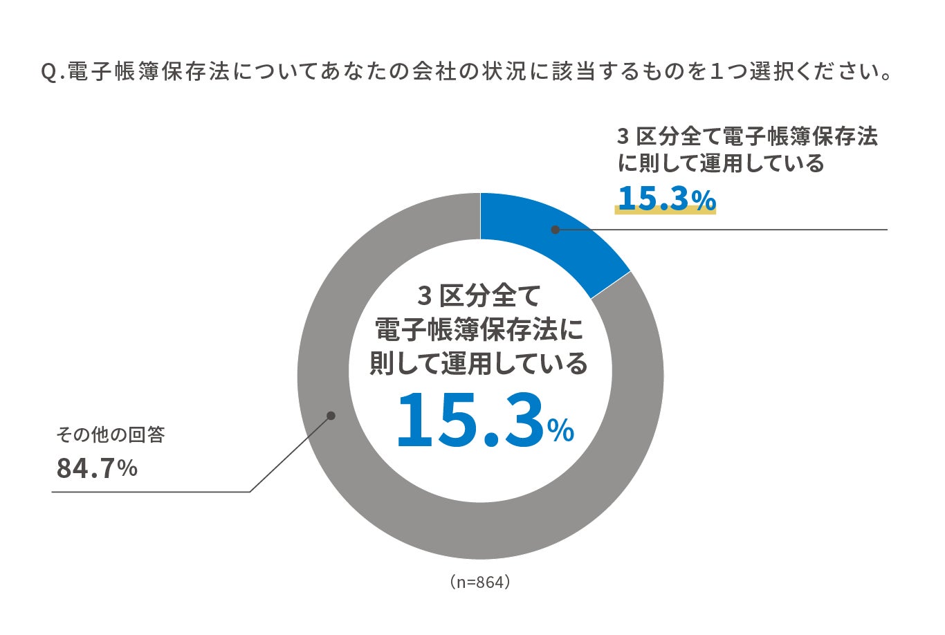 帳簿書類の保存、スキャナ保存、電子取引データの保存、全て「則して運用している」と回答した企業の割合は15.3%となり、84.7%の企業は未だ対応ができていない状況となっています。