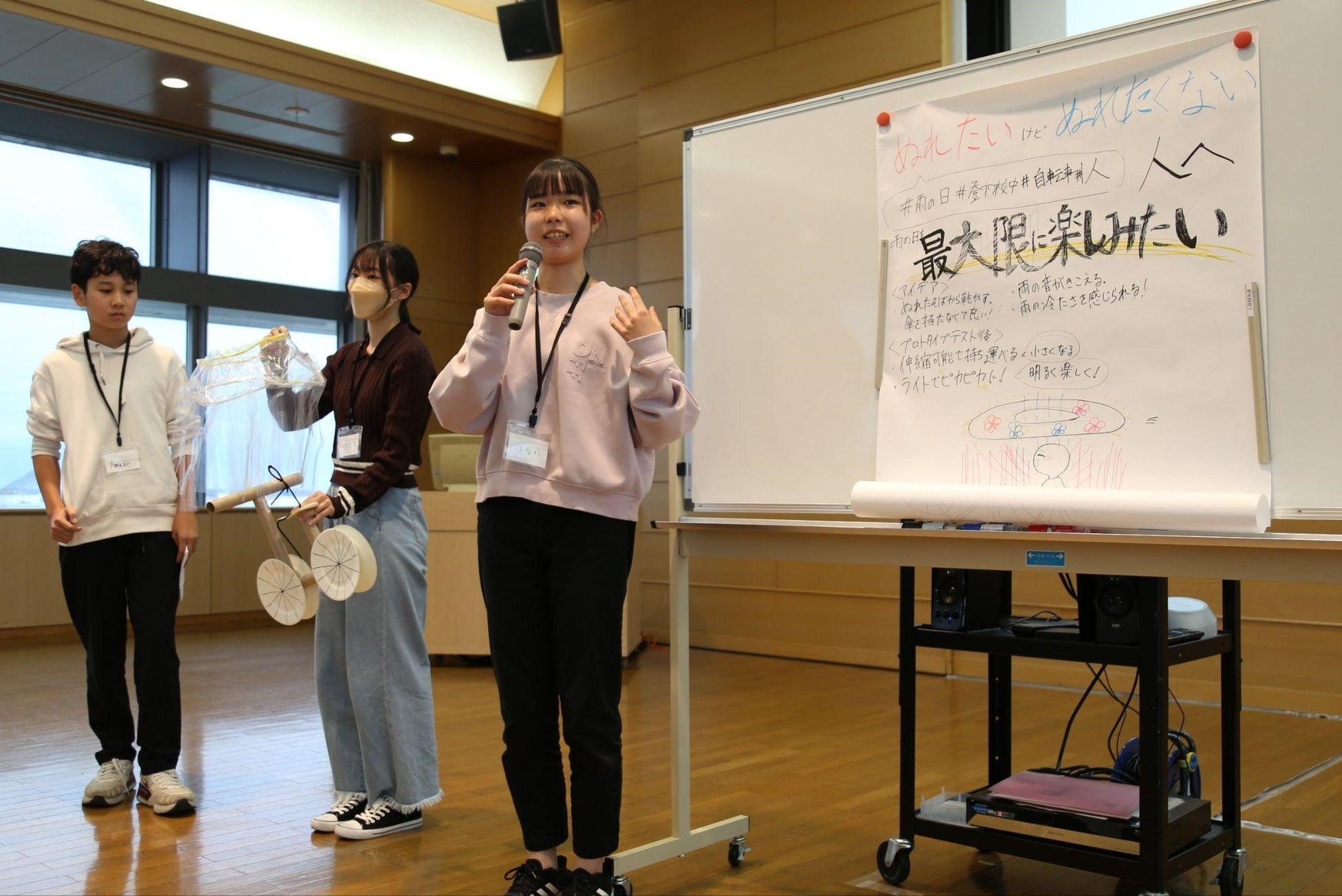 最優秀賞チームのテーマは「スマホを見すぎて罪悪感を抱く人へ!new 3Dカバー」、2位チームのテーマは「ぬれたいけどぬれたくない 雨の日を最大限に楽しみたい」、3位チームのテーマは「ズボラにおすすめノンストレスハンガー」でした。