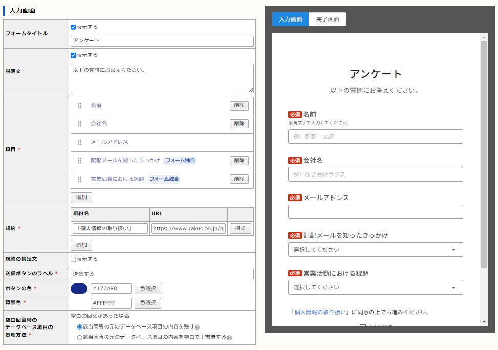 フォーム項目や入力例だけでなく、フォーム入力後の完了画面やメールも自由に設定できます。 作成したフォームはWebサイトに埋め込んだり、URL化して共有することもできるので、自社の運用に合わせてご活用いただけます。