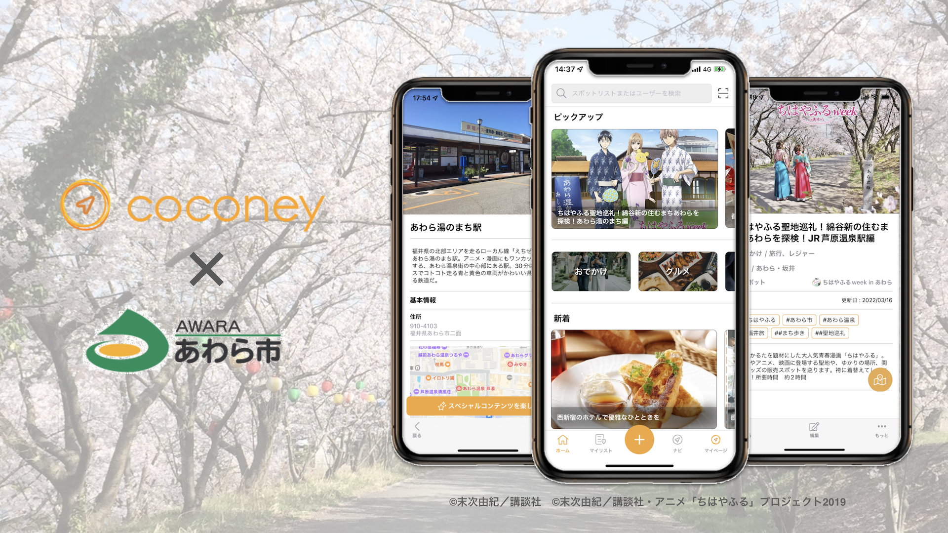 あわら市内の回遊性向上を目的とし、coconeyを活用して『ちはやふる』の聖地を巡礼し、特定のスポットで千早・新のARキャラクターが出現し、音声を聴いたり、記念撮影体験ができる実証実験を開始しました。