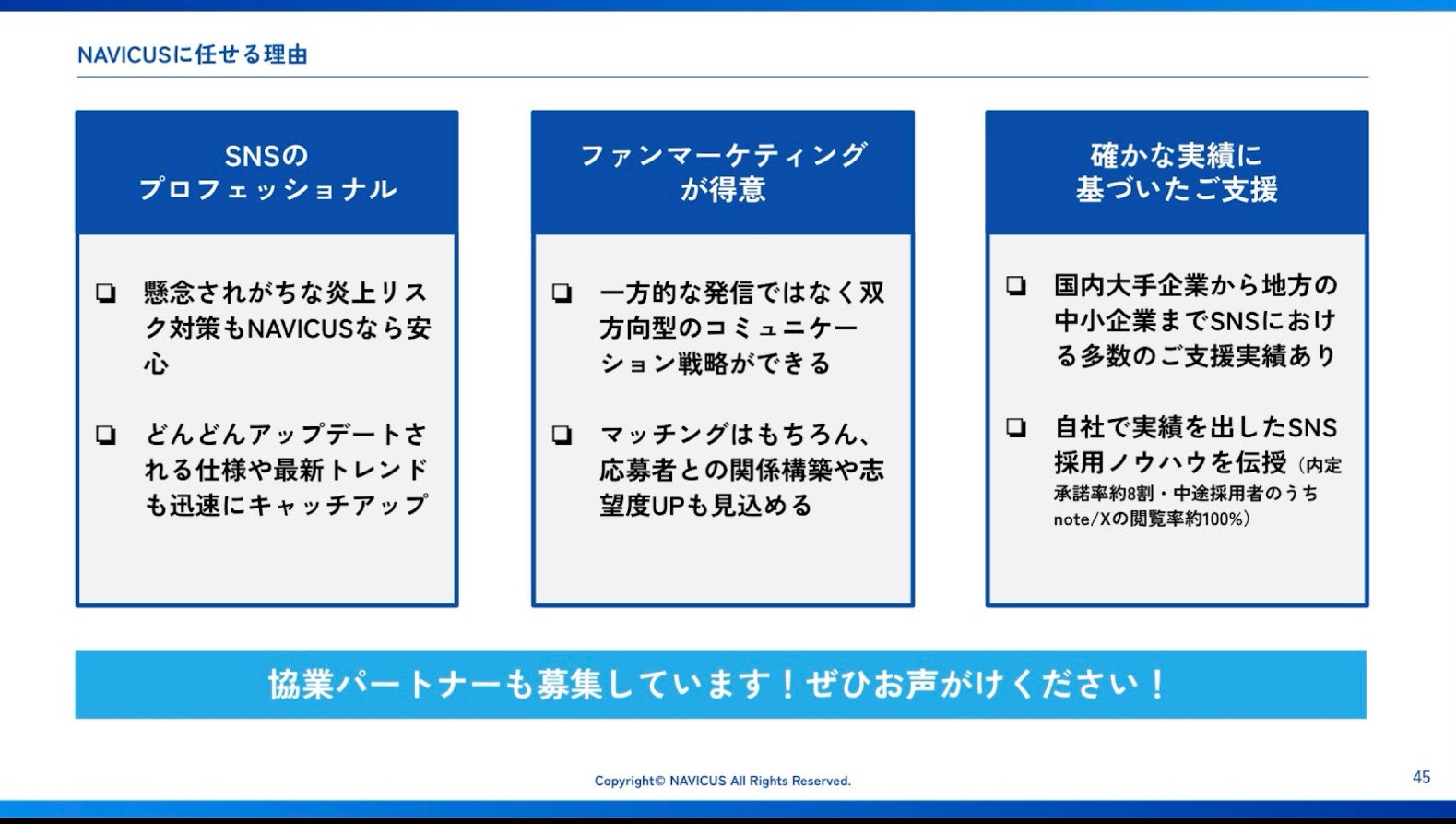 採用に関してお悩みの方は、SNSのプロフェッショナルとしての経験と知識を持つNAVICUSにぜひご相談ください!