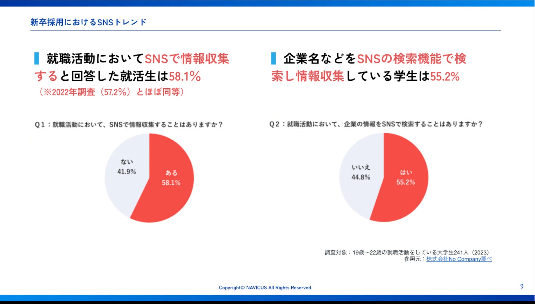 近年は就職活動においてSNSを用いて情報収集し、SNS上の情報を見て選考や入社意向度を高めている就活生が増えており、新卒採用におけるSNSの重要度がますます高まっています。