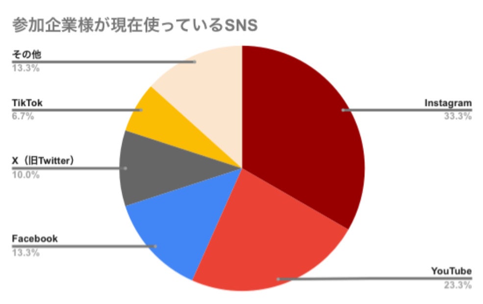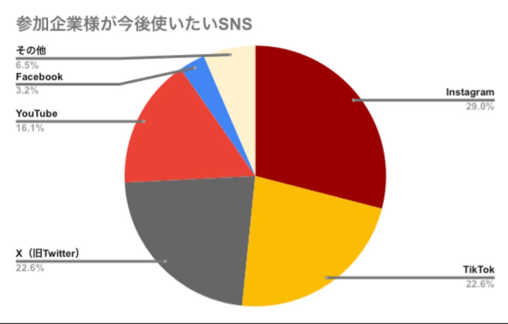 参加企業様が現在使っている採用SNSに関しては、「Instagram」が33%を占め、続いて「YouTube」「Facebook」の使用率が高く、「X」「TikTok」は比較的使用されていませんでした。今後の意向に関するアンケート結果では、X・TikTokの2媒体を使ってみたいという回答が半分近くを占めました。