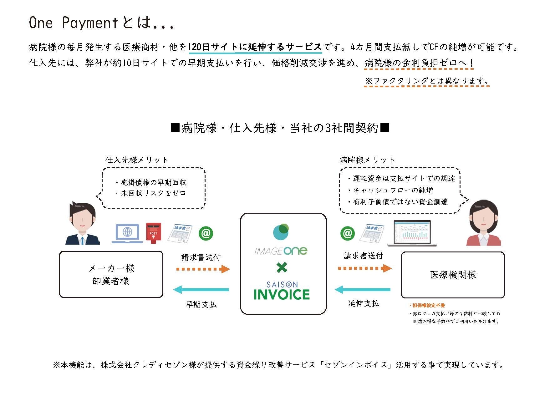 「ONE Viewer」は、レセプト請求ファイル及び財務情報の集計・分析とその可視化により、医療機関経営者の迅速かつ的確な意思決定を支援する、国内初※1の医療経営のための「セキュアクラウドシステム※2」です。「ONE Payment」は、仕入先と医療機関双方にメリットがある支払代行サービスです。仕入先は売掛債権の早期回収と未回収リスクのゼロ化が図れ、医療機関は資金の確保によりキャッシュ・フローが改善された経営を実現します。また、「ONE Viewer」とのシームレスな統合により、経営管理と財務管理が一元管理され、効率的な医療機関経営が可能になります。