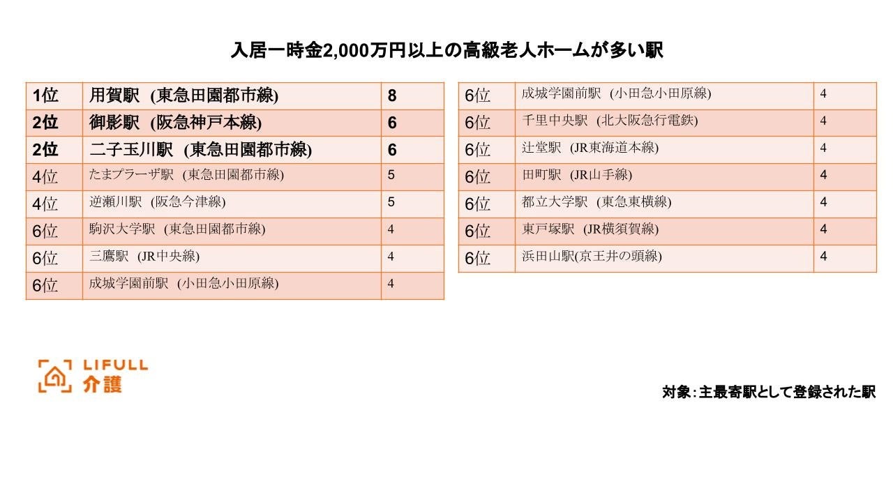 高級老人ホームが多い駅は、東急田園都市線の用賀駅でした。同線の二子玉川駅(2位)、駒沢大学駅、近場で東急東横線の都立大学駅も上位にランクインしており、高級老人ホームが集まる中心エリアであることがわかります。