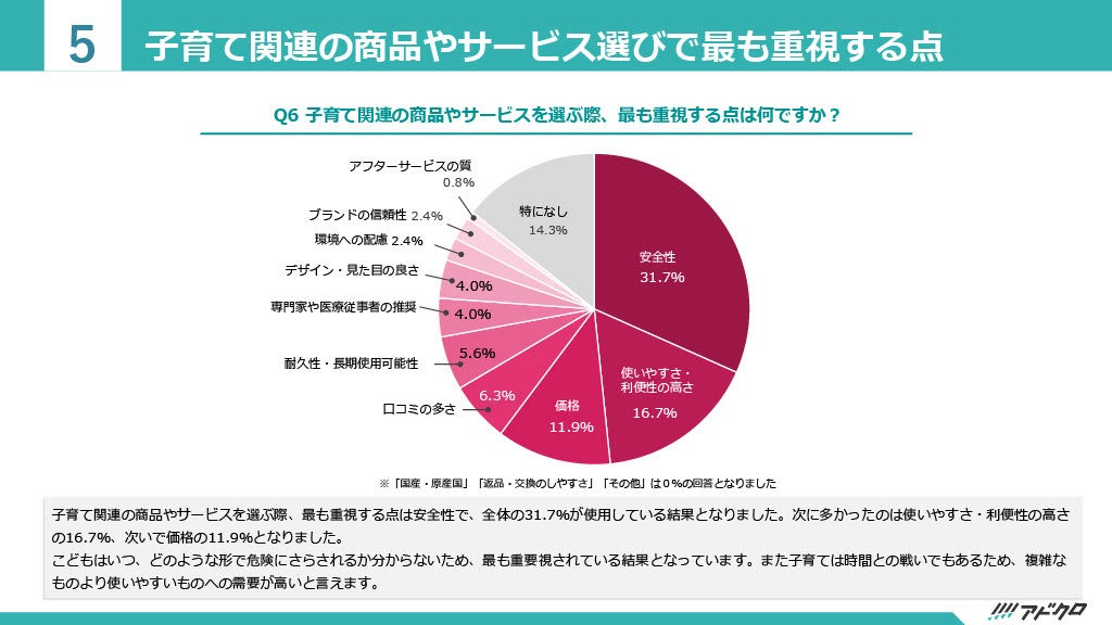 子育て関連の商品を選ぶ際には、安全性と利便性を重視する傾向が強く、特に子供の身の回りに関わる商品については、安全に関する情報が購買決定に大きな影響を与えます。