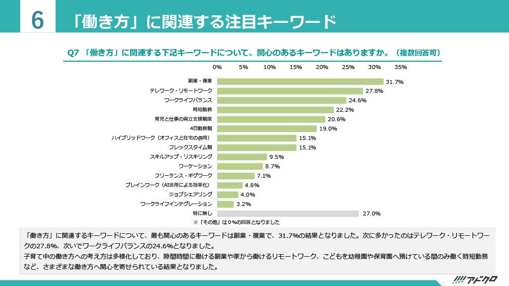 子育て中の働き方への考え方は多様化しており、隙間時間に働ける副業や家から働けるリモートワーク、こどもを幼稚園や保育園へ預けている間のみ働く時短勤務など、さまざまな働き方へ関心を寄せられている結果となりました。