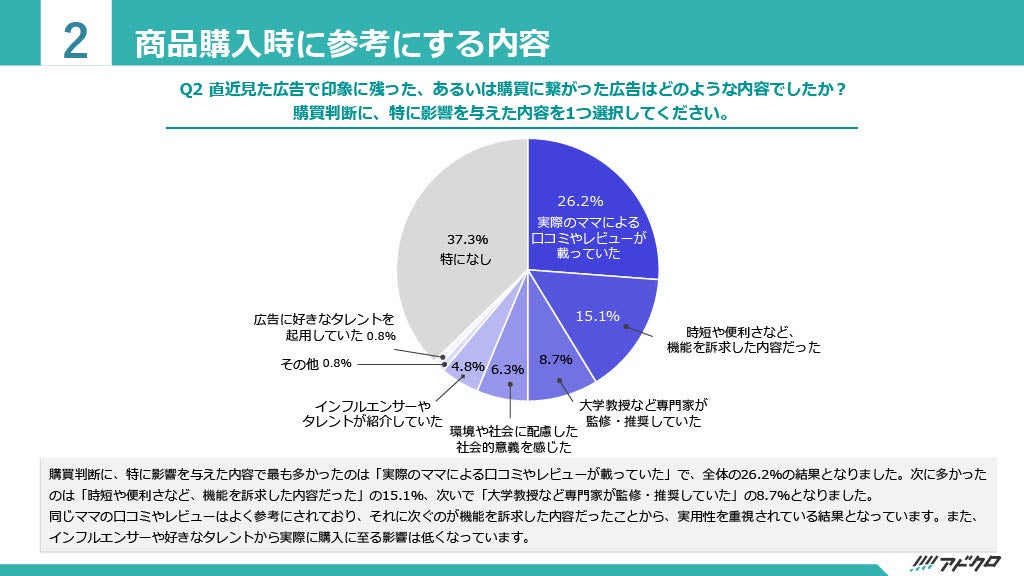 商品の購買判断に特に影響を与えた内容として、実際のママによる口コミやレビューが載っていたかが最も重視されており、広告よりも、時短や便利さなど、機能性を訴求した内容の影響力が大きくなっています。