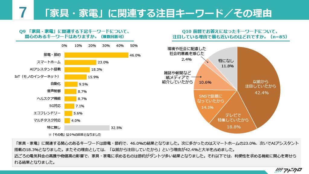 「家具・家電」に関連する関心のあるキーワードについては、46.0%の「節電・節約」が最多となりました。次いで「スマートホーム」が23.0%、「AIアシスタント搭載」が18.3%となりました。