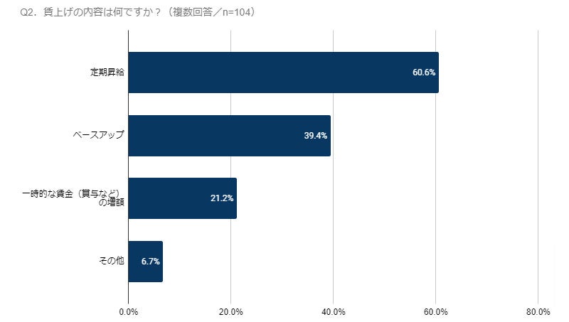 ・賃上げ内容は「定期昇給」がもっとも多く、60.6%が回答。「ベースアップ」は40%に迫る結果となった