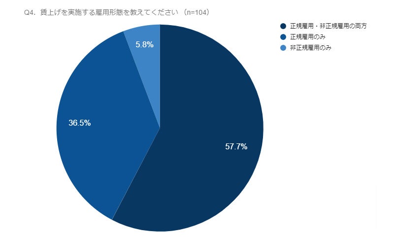 賃上げの対象となる従業員の雇用形態について質問したところ(n=104)、57.7%の事業所が「正規雇用・非正規雇用の両方」と回答。雇用形態に関係なく賃上げを実施する事業所が半数以上を占めました。