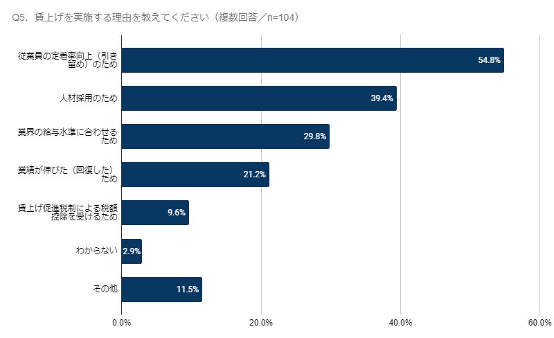 賃上げ理由の1位は「従業員の定着率向上(引き留め)のため」で、54.8%が回答しています(n=104)。2位は「人材採用のため」、3位には「業界の給与水準に合わせるため」が続き、人材確保に関わる回答が上位に並びました。一方、「業績が伸びた(回復した)ため」は21.2%、「賃上げ促進税制による税額控除を受けるため」は、9.6%です。