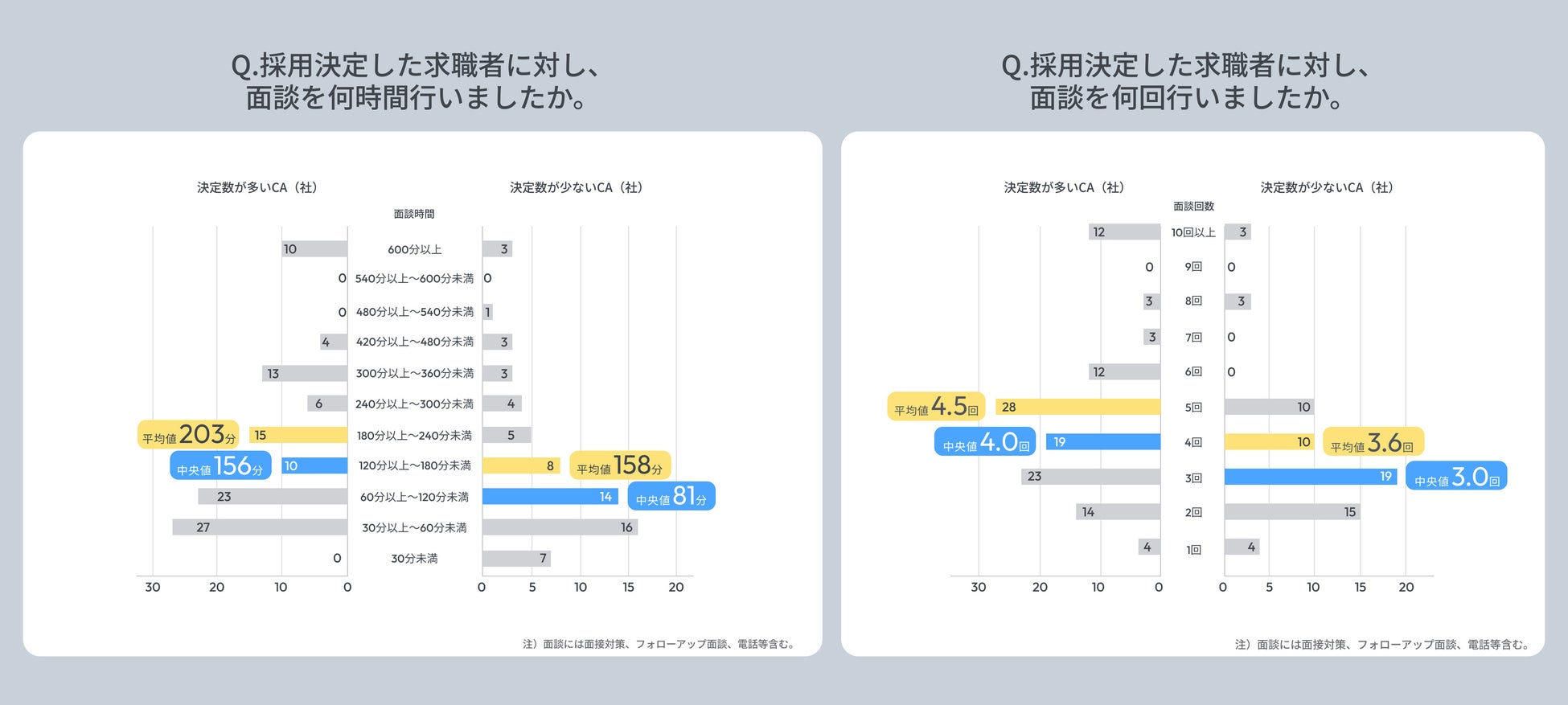 採用決定人数が平均よりも多いCAにおいて、一人の求職者に対する面談時間の中央値は156分。面談回数の中央値は4.0回。