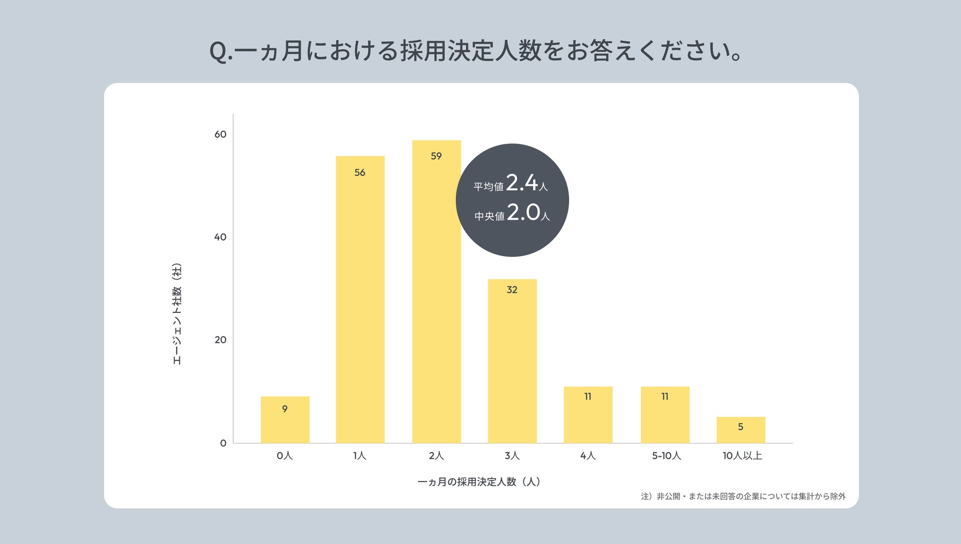 2.キャリアアドバイザー1人あたりの月間採用決定人数の平均値は2.4人、中央値は2.0人。