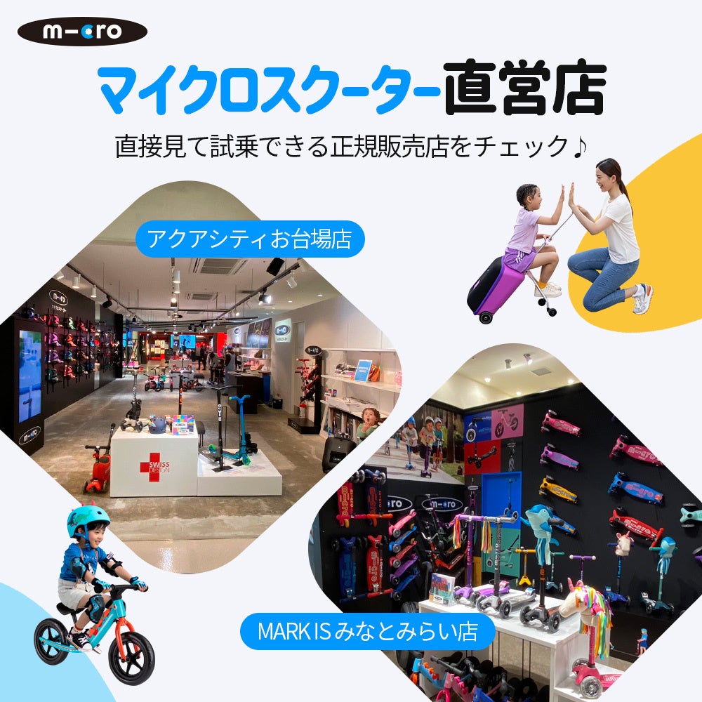 正規代理店の直営店であるアクアシティお台場店とMARK IS みなとみらい店はキックボード、ヘルメットやプロテクター、アクセサリー、インラインスケートまでたくさんの製品を揃え、大人から子どもまで家族一緒に楽しめる売り場です。お出かけシーズンたくさんのお客様のご来店をお待ちしております。