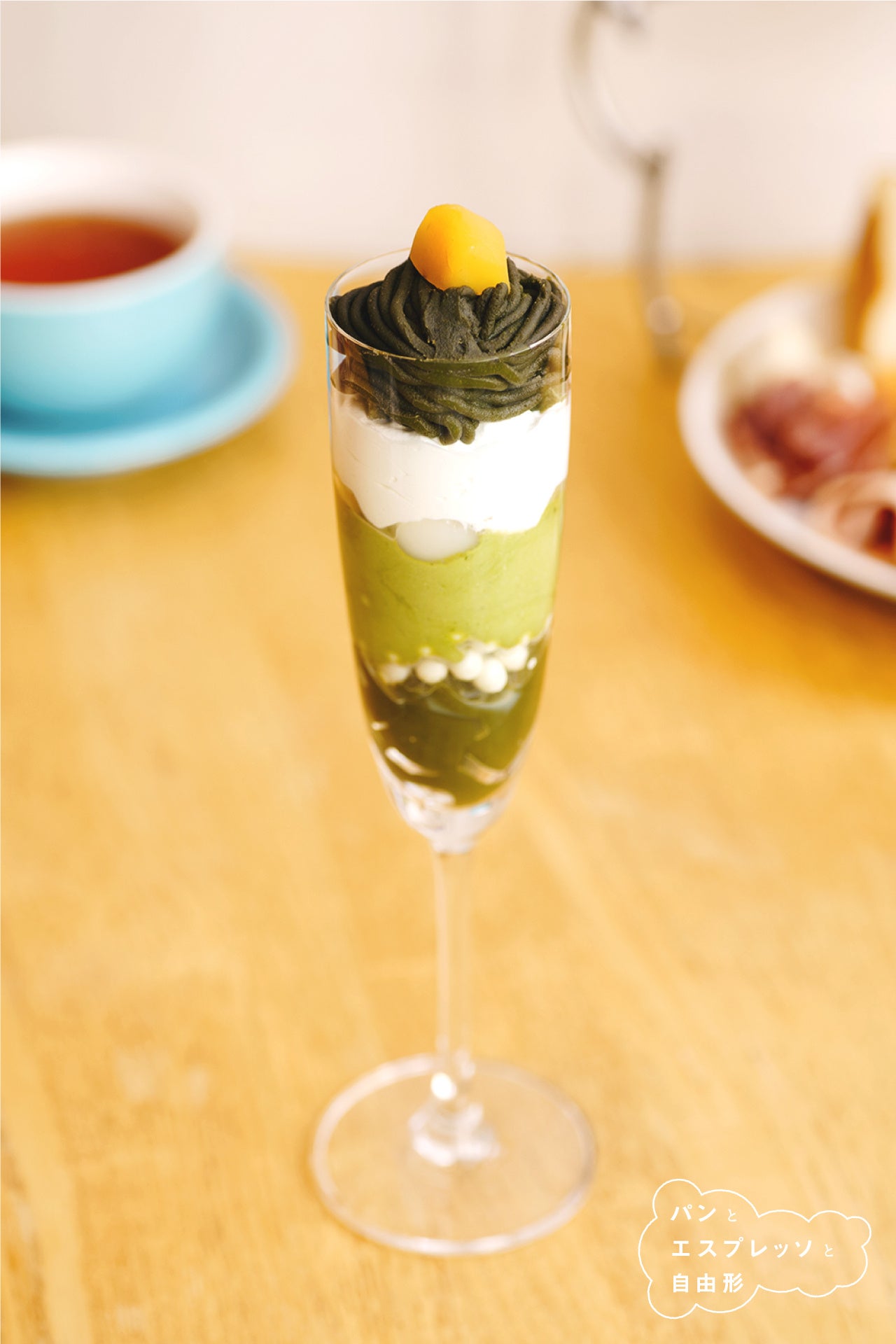 抹茶ゼリー、パールクラッカンホワイト、抹茶マスカルポーネクリーム、白玉、栗の甘露煮、マスカルポーネクリーム、抹茶チョコ、抹茶モンブランを層にしました。
