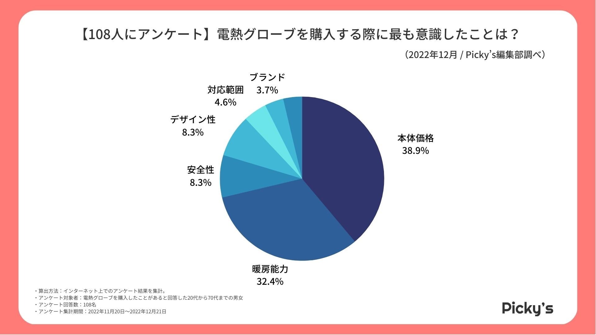 「Picky’s」は、インターネットショッピングにおいて、購入前に試せない・選ぶべきものがわからないという課題の解決を目標に、あらゆる商品のおすすめランキングや検証レビューを紹介するサイトです。このたびPicky’s(https://rentry.jp/note/)では、電熱グローブを買う際に意識していることや人気のメーカー・ブランドなどをインターネット上でアンケート調査を行い、ランキングを作成いたしましたので発表いたします。