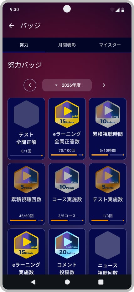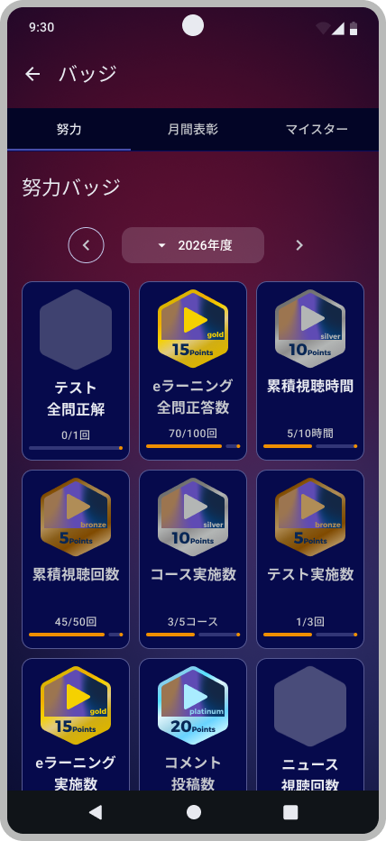 視聴数や時間に応じた「努力バッジ」、社内1位を称える「月間表彰バッジ」、専門性を極めた「マイスターバッジ」を付与することで、利用者の継続的な動機づけを高めます。