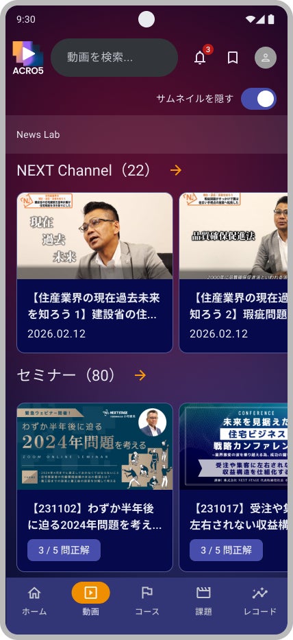 ネクストステージは、2020年にリリースした建築業界特化型学習動画サービス「ACRO5」により、累計利用者数9,000名を突破する実績を積み上げてきました。 今回のフルアップデートでは、個人の意欲に依存しがちだった「能動的な学習の場」を、日々の情報収集という日々のルーティンの中で自然と知見に触れ続けられる「日常の習慣」へと、学びの在り方そのものを変革します。