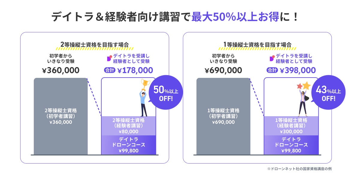 今回の業務提携により、デイトラでUASlevel2を取得した受講生は、”経験者枠”を利用して約10万円の講習費用で各スクールに入学することが可能となります。デイトラではオンラインスクールであることもあり、約10万円でUASlevel2の取得に向けた学習を行えます。これにより、デイトラの受講生は、合計約20万円で国家資格取得にむけた学習を行えるため、資格取得のコストを大幅に抑えられます。